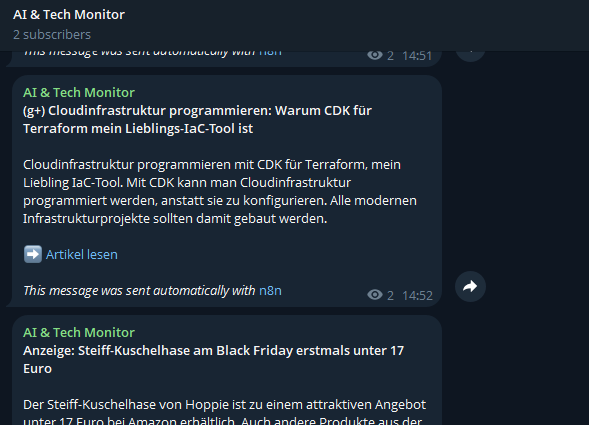 Einleitung Jeden Tag erscheinen hunderte neue Artikel über KI und Technik. Niemand hat die Zeit, das alles manuell zu durchsuchen. Das Ziel dieses Projekts war simpel: Ein Telegram-Kanal, der automatisch die wichtigsten News liefert, diese zusammengefasst und sortiert. Das Ergebnis dieses Systems ist für jeden zugänglich. Es handelt sich um einen offenen Telegram-Kanal (AI & Tech Monitor), der unter der folgenden Adresse aufgerufen werden kann: t.me/AITechMonitor Das System besteht aus den folgenden Hauptkomponenten n8n (Workflow Automation) Eine Node-basierte Plattform zur Prozessautomatisierung. Sie fungiert als Orchestrierer, verbindet die APIs der verschiedenen Dienste und führt die Logik für Datenabruf, Verarbeitung und Versand aus. ...