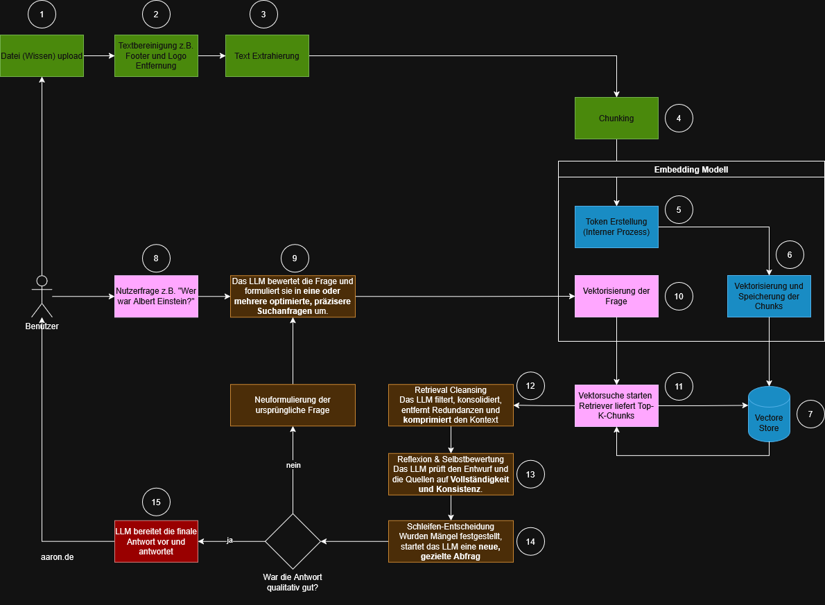 RAG Retrieval-Augmented Generation (RAG) ist heute eine verbreitete Methode, um Large Language Models mit externem Wissen zu verbinden. Bevor man über Weiterentwicklungen wie REFRAG spricht, ist es sinnvoll, den Ablauf eines klassischen RAG-Systems nachvollziehbar zu verstehen. Das untenstehende Diagramm zeigt den Standardprozess. Die Schritte sind farblich gruppiert, nummeriert und lassen sich gut in vier Bereiche einteilen: RAG Prozessbeschreibung Schritte 1 - 4: Preprocessing (Datenaufbereitung) Schritte 5 - 7: Embedding ...
