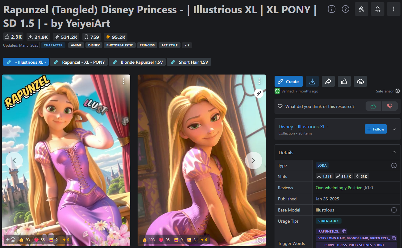 In diesen Foren wurde das Prinzip von LoRA nicht anhand abstrakter Formeln erläutert, sondern sehr anschaulich am Beispiel von Bildern der Disney-Märchenfigur Rapunzel. Die Diskussionen konzentrierten sich weniger auf die theoretischen Grundlagen als vielmehr auf die praktische Umsetzung: Wie erlangt man gezielte Kontrolle über den Stil und die Darstellung einer Figur? Daraus entwickelte sich eine Eigendynamik, getrieben von dem Wunsch, die Figur in unzähligen Szenarien darzustellen von harmlosen Porträts bis hin zu sehr grenzwertigen Inhalten. Auch wenn diese Anwendungsfälle teils abwegig erscheinen, demonstrieren sie doch eindrucksvoll, mit welcher Präzision LoRA ein Modell in eine bestimmte Richtung lenken kann.