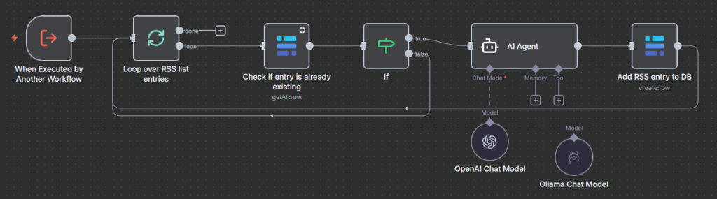 Workflow 02 – Read Feed-Entries: Dieser Workflow ist für die intelligente Verarbeitung und Speicherung zuständig und wird direkt vom ersten Workflow mit den Artikeldaten gefüttert. Zunächst prüft er für jeden eingehenden Artikel in der Baserow-Datenbank, ob der Link bereits existiert, um Duplikate konsequent auszuschließen. Handelt es sich um einen neuen, noch unbekannten Artikel, übergibt der Workflow den Inhalt an einen AI-Agenten, der über Ollama (Modell Llama 3) läuft und eine kurze Zusammenfassung des Textes erstellt. Das Ergebnis bestehend aus Titel, Link und der generierten Zusammenfassung werden innerhalb der Datenbank gespeichert.