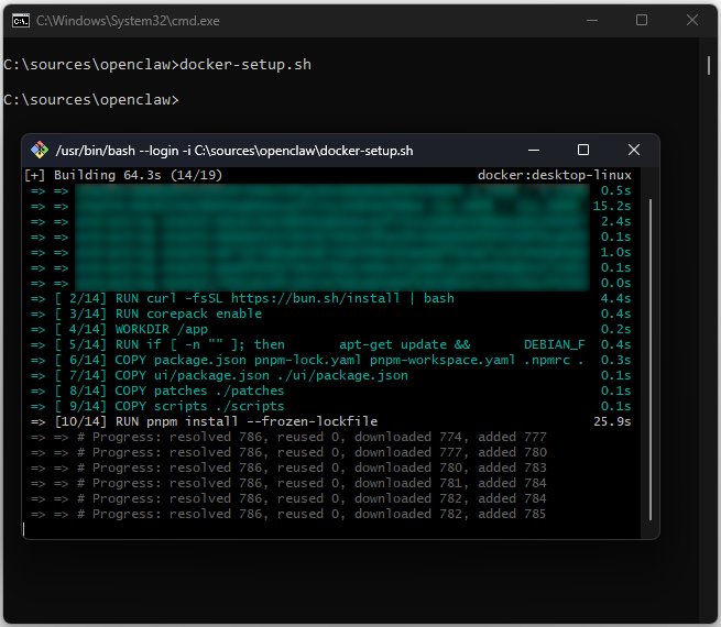 Anschließend wird in das neu erstellte Verzeichnis gewechselt. Im Zielverzeichnis wird das Setup-Skript ausgeführt. Das Skript initiiert den Build-Prozess innerhalb des Docker-Containers. Dabei werden systemrelevante Abhängigkeiten und Paketmanager wie bun, corepack und pnpm installiert und konfiguriert.