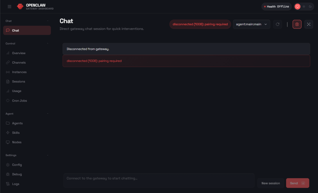 Anschließend ist der OpenClaw GUI unter der zuvor angegebenen URL zu erreichen. Sollte das Web-Interface den Status „Disconnected“ anzeigen, ist eine manuelle Anpassung der Konfigurationsdatei notwendig.