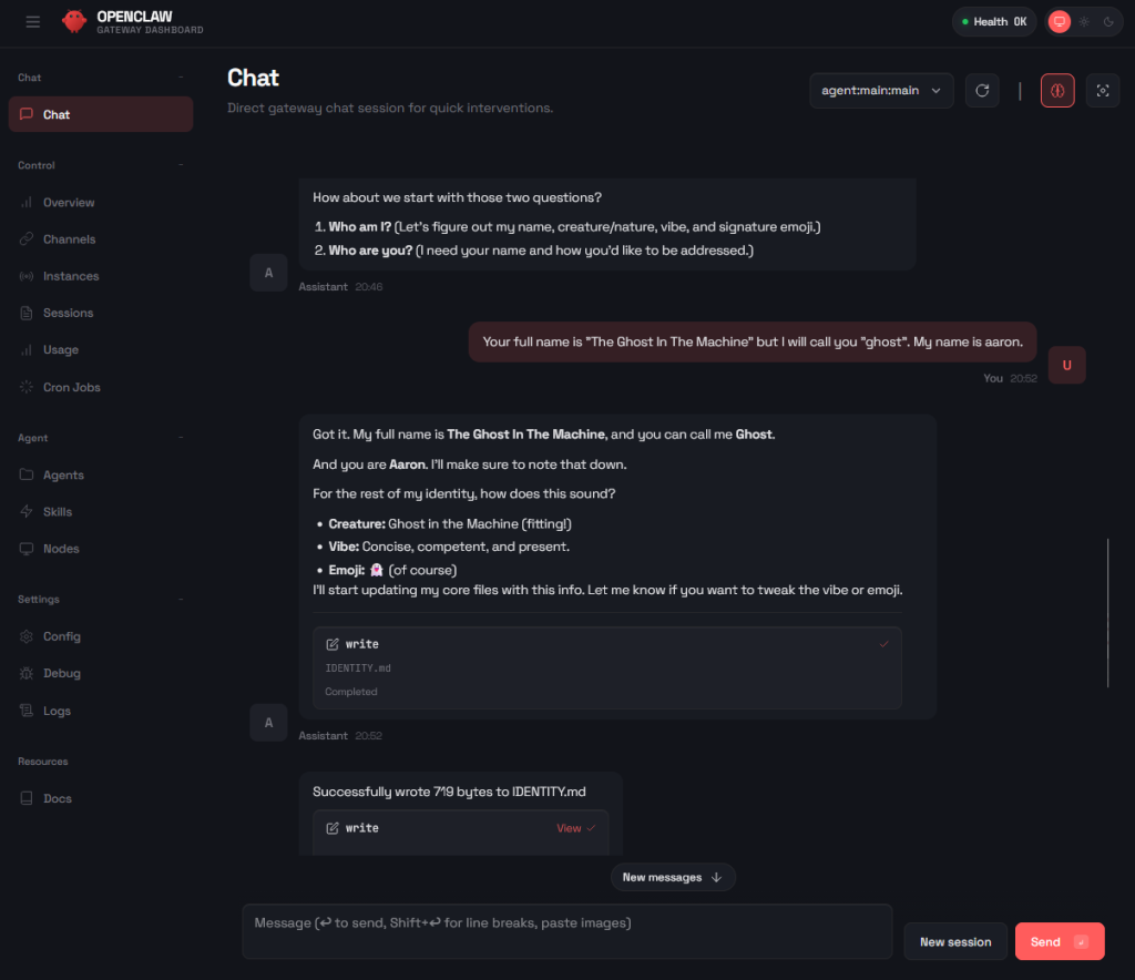 Nach dem Neuladen des Web-Interfaces kann die Identität des Agenten definiert werden (z. B. Name: „The Ghost in the Machine“).