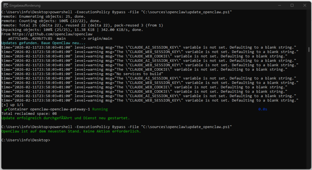 Write-Host "OpenClaw ist auf dem neuesten Stand. Keine Aktion erforderlich." -ForegroundColor Gray