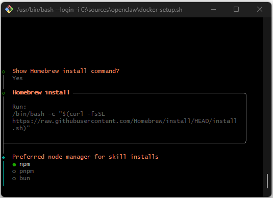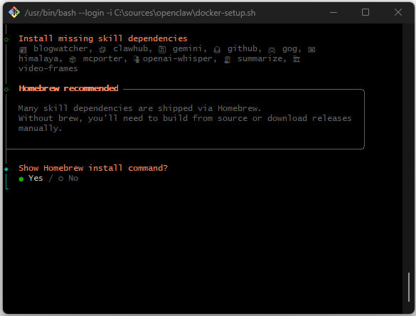OpenClaw prüft den Status verfügbarer Erweiterungen („Skills“). Das System listet fehlende Abhängigkeiten für Module wie github, openai-whisper oder gog (Google Workspace) auf. Zur Auflösung dieser Abhängigkeiten wird die Installation von Homebrew innerhalb der Umgebung angeboten und bestätigt.
