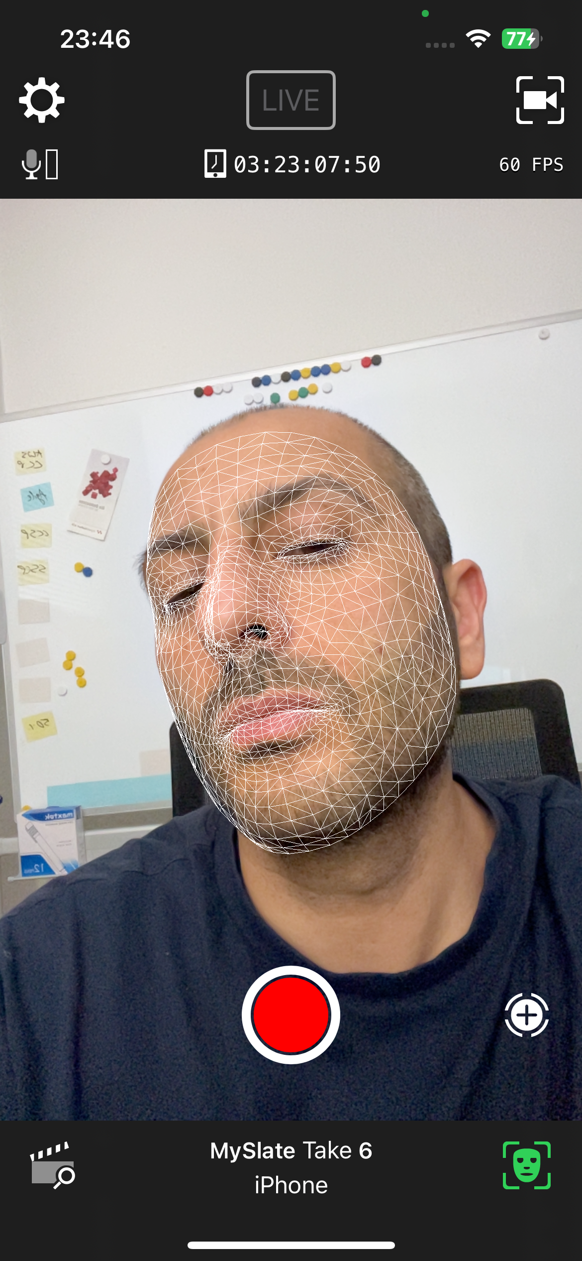 After selecting „Live Link (ARKit)”, a wireframe-like mesh is overlaid on the face, representing the detected facial movements in real time. The app uses the iPhone’s front camera to track facial expressions, eye movements, and head position.
