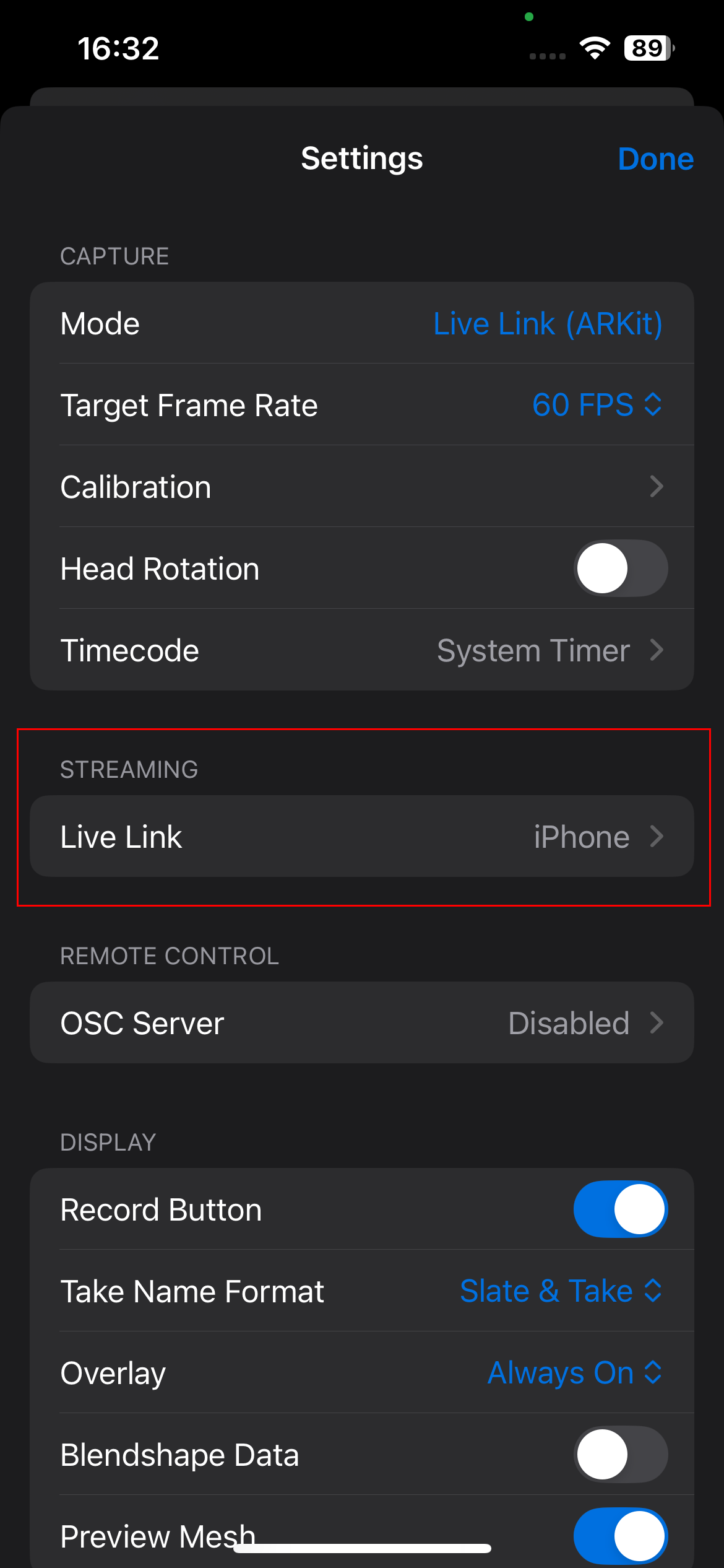 This screen appears when launching the Live Link Face App and is used to select the desired recording mode. Live Link (ARKit): Uses Apple’s ARKit framework to capture facial animations directly on the device. The blendshape data is transmitted over the local network in real time to Unreal Engine. This is the standard mode for live facial animation with Metahumans.
