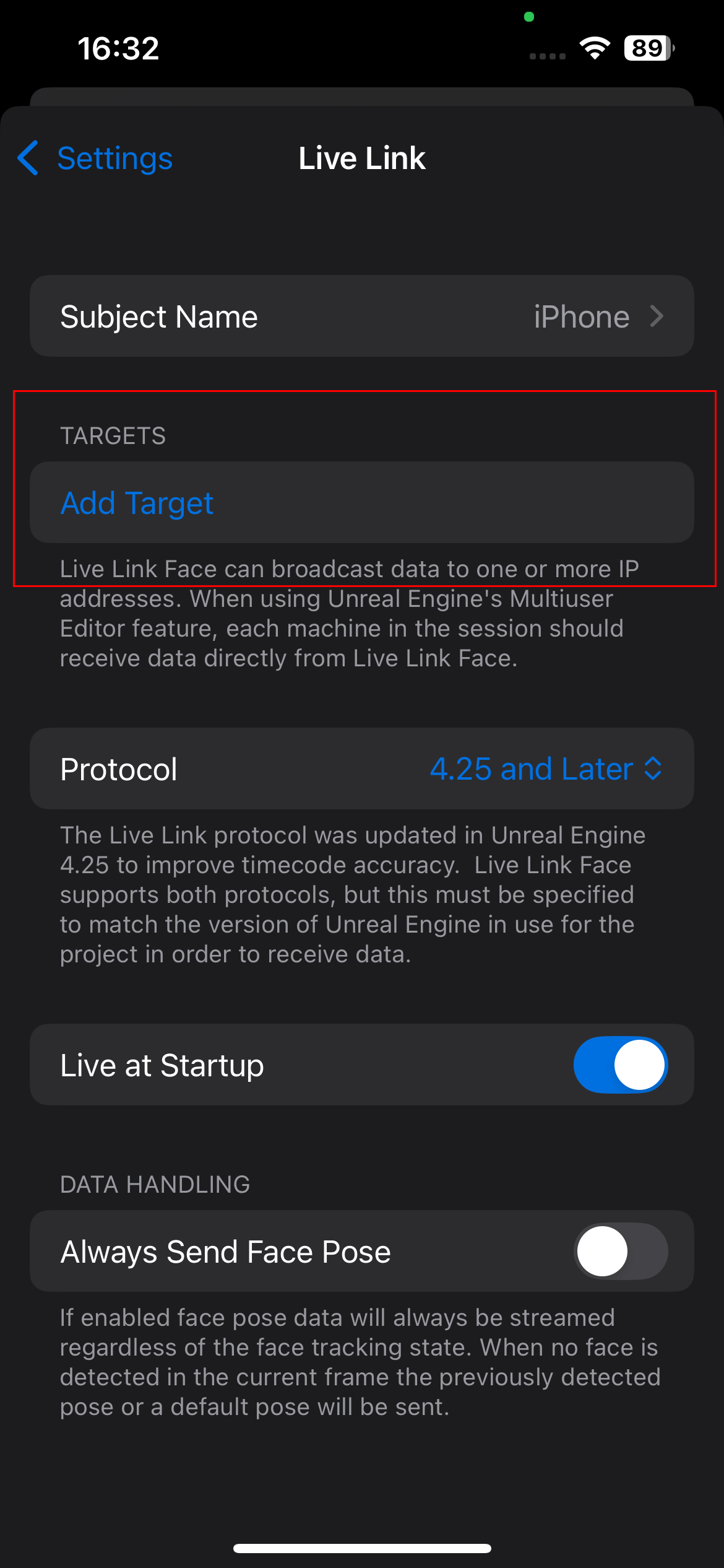 This IP address is then entered into the Live Link Face App. The stream is sent to this address over the local network in real time.
