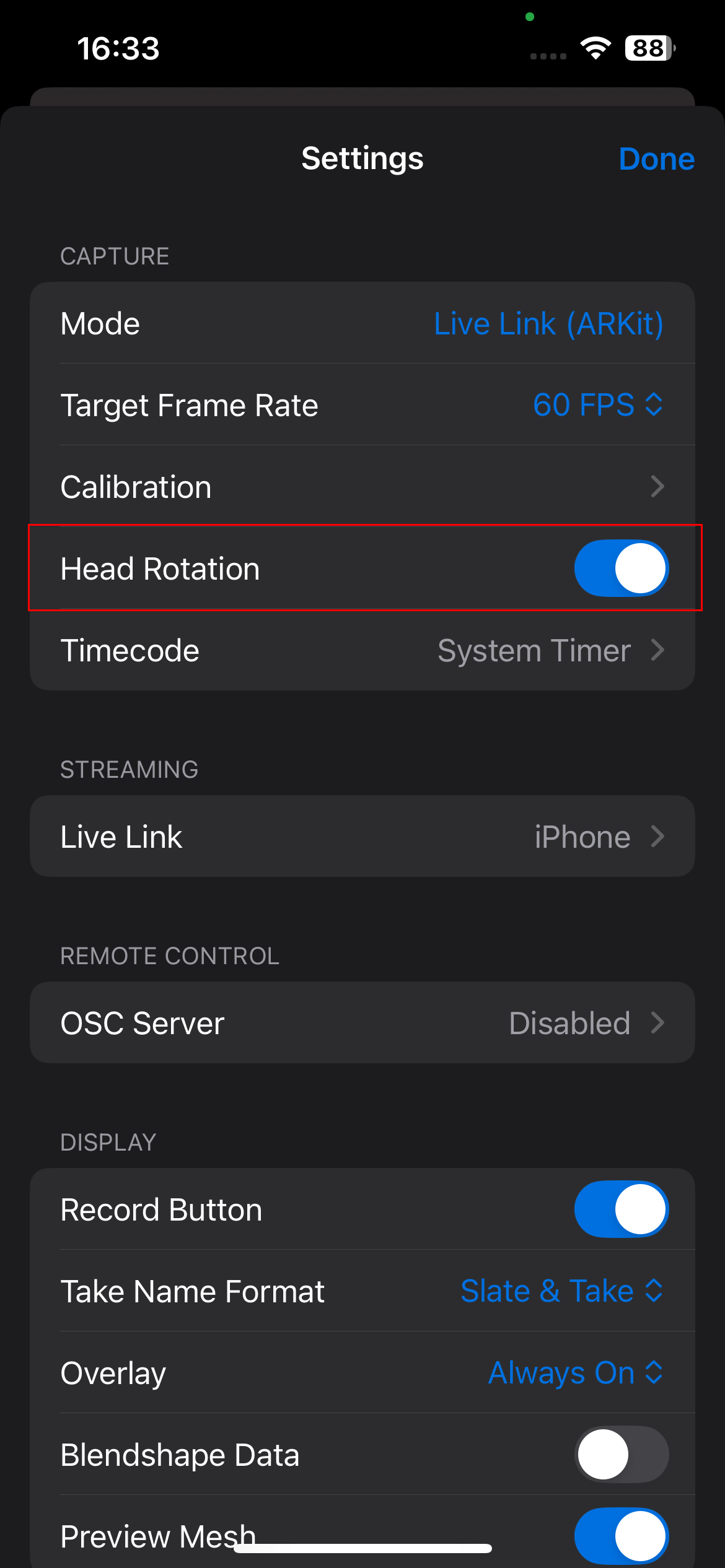 The „Head Rotation” option controls whether the head movements (rotation, tilt, nodding) of the face are captured and transmitted to Unreal Engine. If it is deactivated, only the facial expressions are transmitted, while the head of the digital character remains in its position. This can be useful, for example, when only the facial expressions are needed but no head movement.