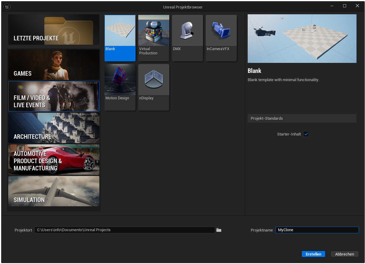Next, we launch Unreal Engine and create a blank project under the „Film / Video & Live Events” category. This category is particularly suitable for projects with Metahumans and facial animation, as it is geared towards cinematic applications. We choose the „Blank” template to use a minimally prepared environment in which we can configure all necessary components ourselves.