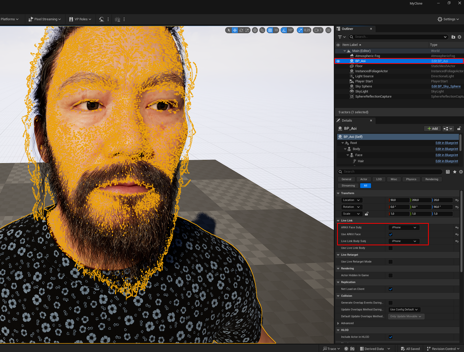 In the Details panel of a Metahuman character (here BP_Aoi), the connection to the Live Link Face App is established. The fields are used to link the data stream of the facial and, if applicable, body animation to the Metahuman: