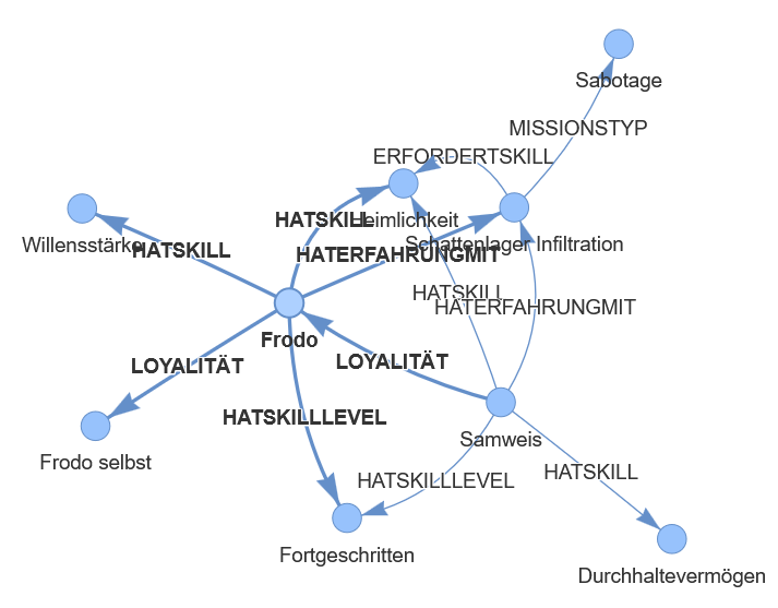 Through queries like „MATCH (c:Charakter)-[:HATSKILL]->(s:Skill) WHERE s.name = ‘Heimlichkeit’“ one can specifically find all entities that are connected to the searched concept.Path-based selection