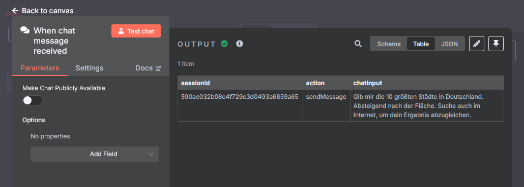 Processing begins with the node When chat message received. It passes the following data to the agent: