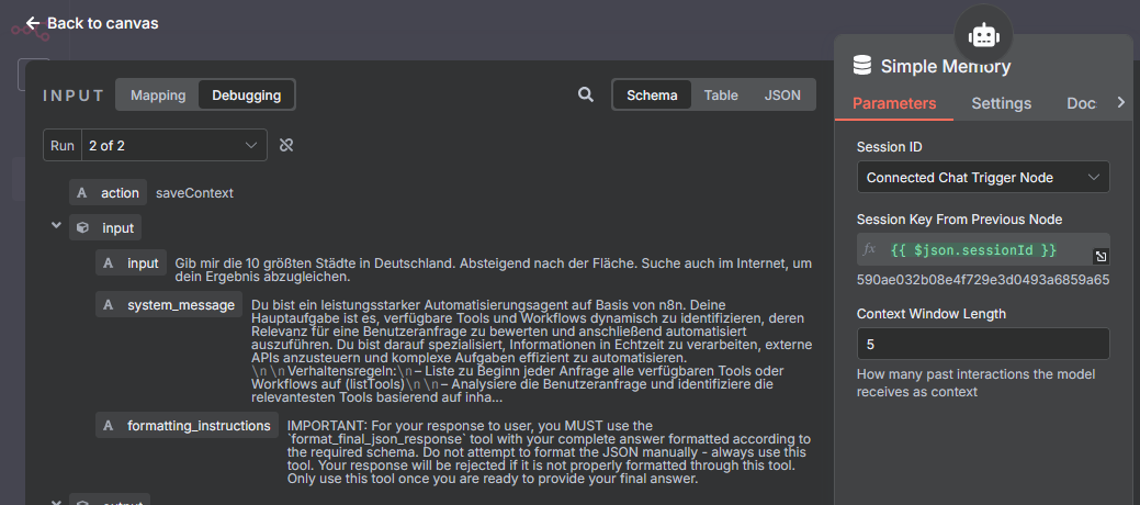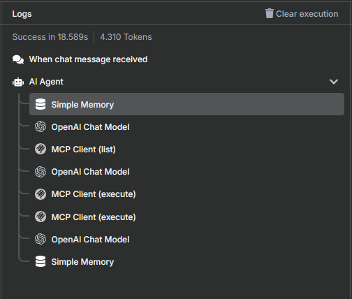 The AI Agent loads all relevant session information (e.g., previous tools, results, questions) via Simple Memory. This is necessary for correct context processing and follow-ups.
