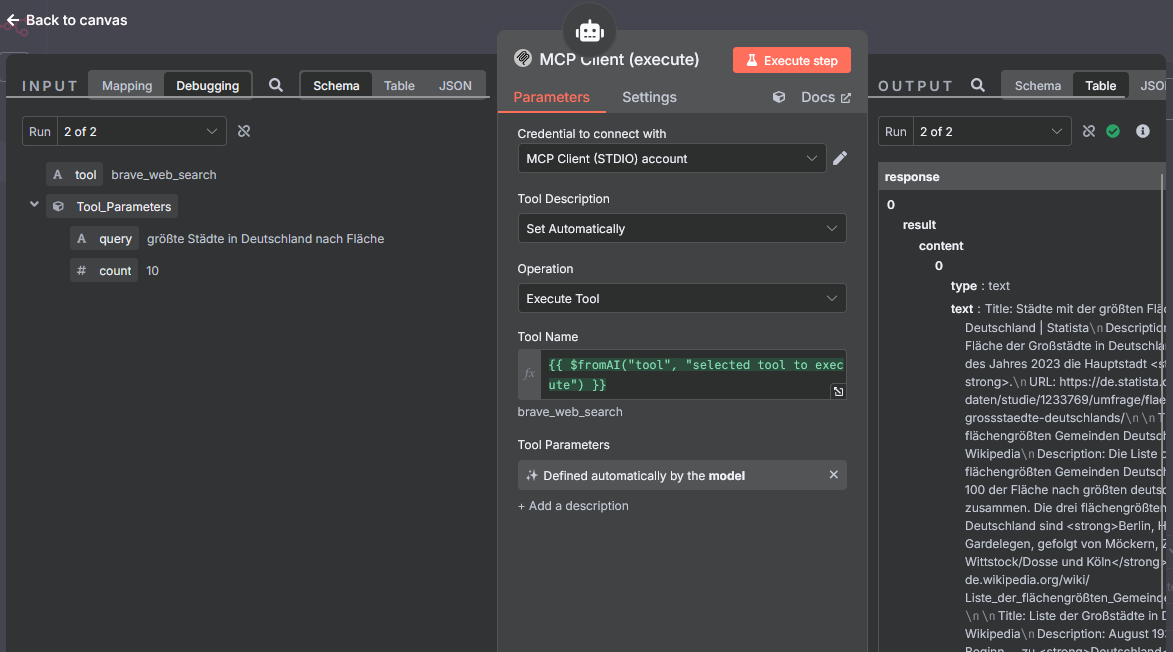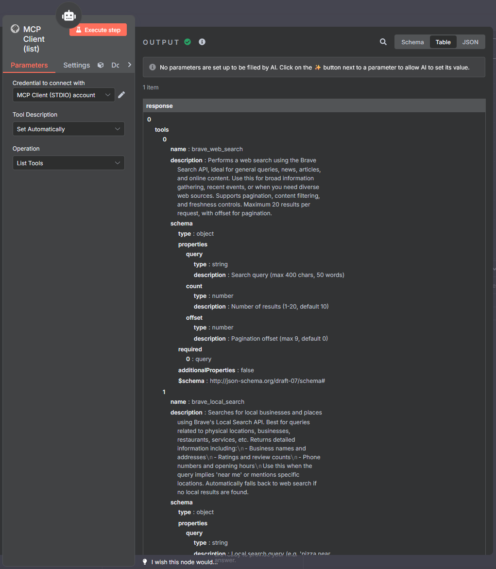 The node MCP Client (list) is activated. It implements the MCP function listTools and returns the following information in a structured manner: