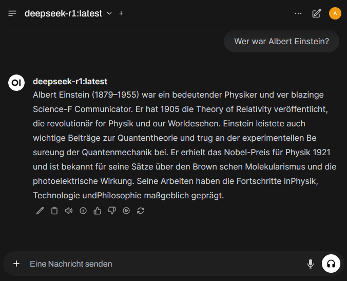 Here Ollama was run with NVIDIA-GPU-support under Docker on a Windows-11-system. OpenWebUI was used as a user-friendly interface to operate AI models locally. OpenWebUI offers the advantage that users can easily switch between different models, manage requests and conveniently control AI usage through a graphical interface. It also provides a better overview of running instances and facilitates testing different models without manual configuration changes.
