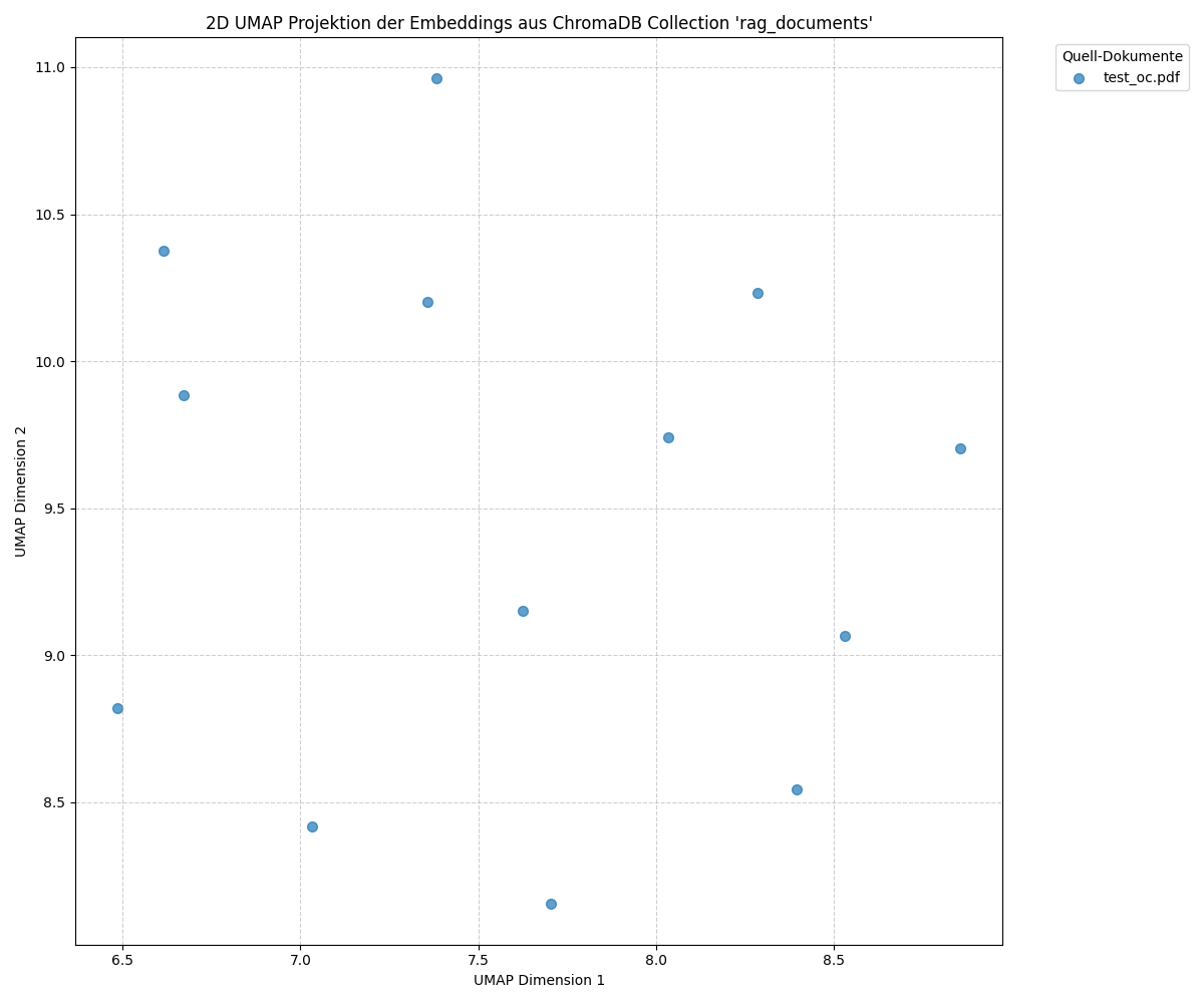 The graphic shows a two-dimensional projection of the vectors computed from the text sections (chunks) of a PDF document. Each point represents a section from the document, whose embedding is visualized in a vector space. The positions of the points in the diagram reflect the similarities between the individual text sections. Points that are closer together represent sections of the document that are more similar in content. Larger distances indicate that the corresponding sections are less thematically or semantically related.