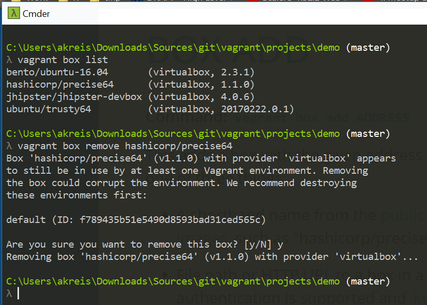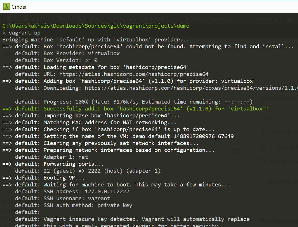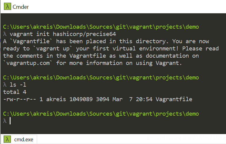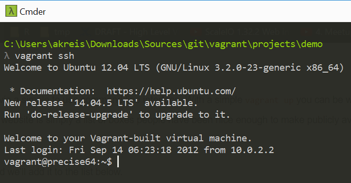 // Initialize folder for Vagrant, i.e. generate ‘Vagrantfile’ vagrant init hashicorp/precise64
