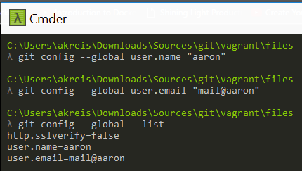 // Create a local git file including entry of username and email git config –global user.name “aaron” git config –global user.email “mail@aaron.de” git config –global –list
