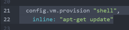 // Shell provisioning (inline) atom Vagrantfile config.vm.provision “shell”, inline: “apt-get update”