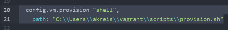 // Embedding the external file within the Vagrantfile cd C:\Users\akreis\Downloads\Sources\git\vagrant\projects\trusty atom Vagrantfile config.vm.provision “shell”, path: “C:\\Users\\akreis\\vagrant\\scripts\\provision.sh”