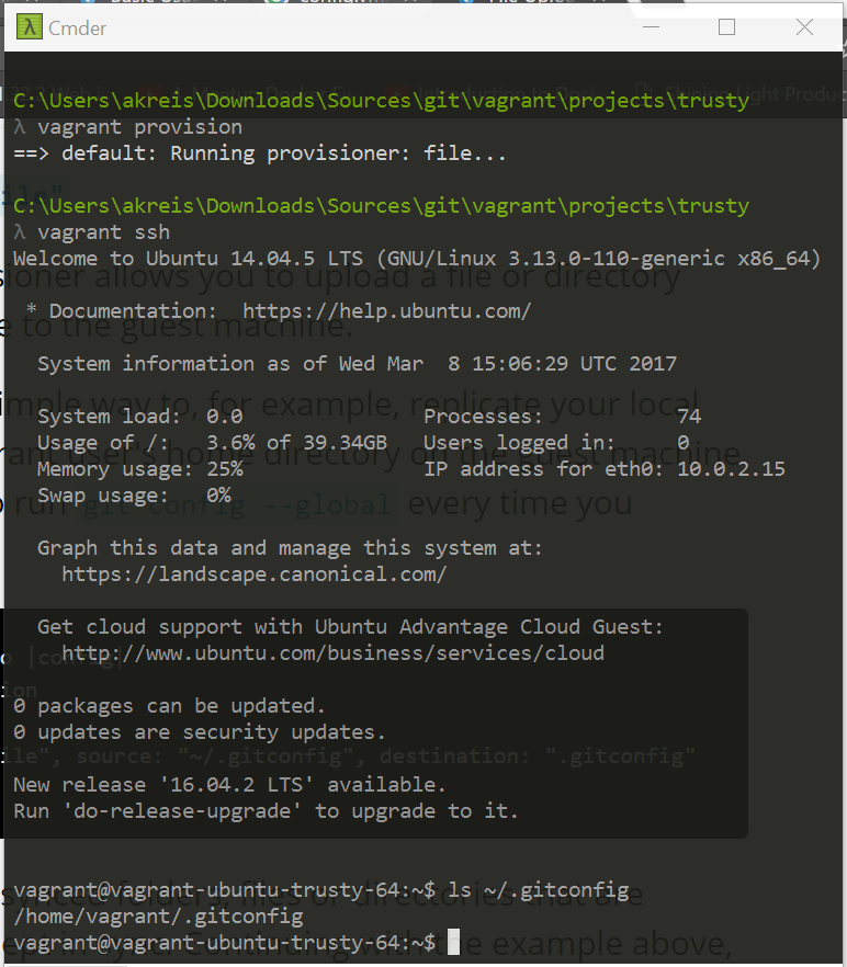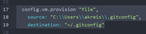 // File provisioning // Embedding a provisioning file within the Vagrantfile atom Vagrantfile config.vm.provision “file”, source: “C:\\Users\\akreis\\.gitconfig”, destination: “~/.gitconfig”