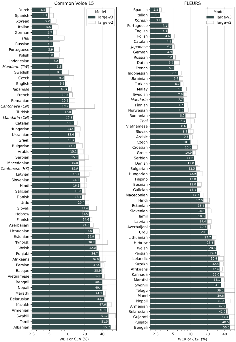 The following graphic by OpenAI shows the accuracy of the various Whisper models in a variety of languages. This performance measurement is based on WER (Word Error Rate) and CER (Character Error Rate), evaluated on the Common Voice 15 and Fleurs datasets. Each Whisper model was tested for a range of languages to illustrate its ability for accurate transcription and its performance differences depending on the language. For example, a WER value of 5.7 for German indicates that the model makes about 5.7 errors per 100 transcribed words, which represents relatively high accuracy. The graphic thus gives you a good idea of which model is particularly effective in which language.