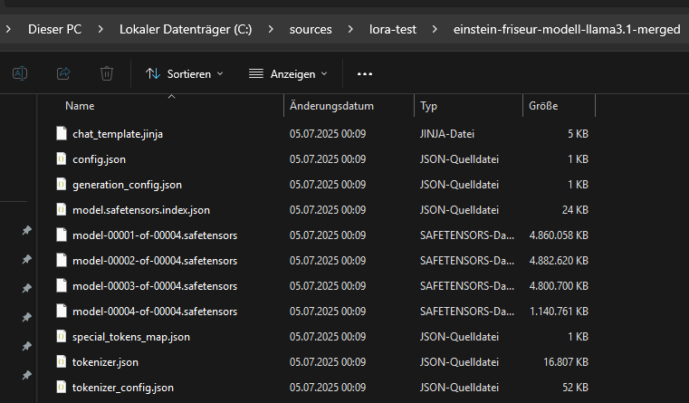 El modelo fusionado consta de los archivos generados en el directorio de destino por el llamado merged_model.save_pretrained(…). Entre ellos se incluyen especialmente el archivo model.safetensors (o pytorch_model.bin, según el formato) y un archivo de configuración config.json. Para modelos grandes como Llama 3.1 8B, los pesos suelen dividirse automáticamente en varios archivos parciales vinculados mediante un archivo de índice como model.safetensors.index.json. Además, se guardan metadatos importantes y archivos de configuración adicionales como generation_config.json, chat_template.jinja y archivos del tokenizador como tokenizer.json, tokenizer_config.json y special_tokens_map.json.