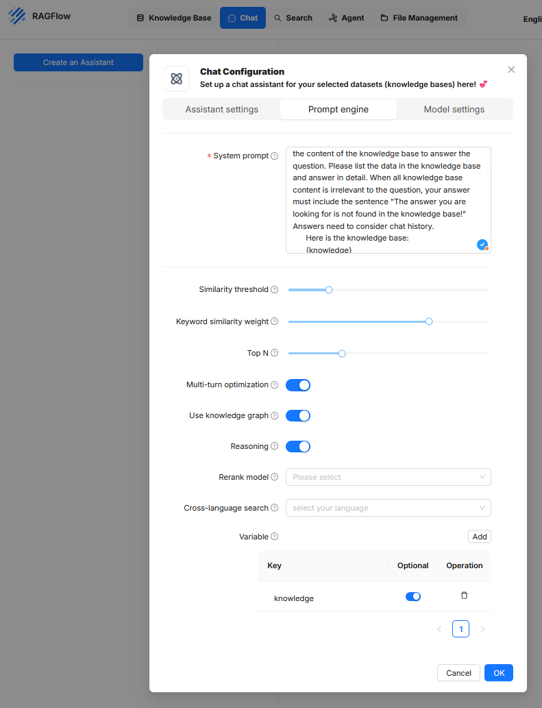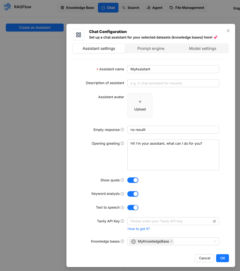 En RAGFlow, un „Assistant“ es una unidad configurable para llevar a cabo diálogos guiados por el usuario en los que se recupera información de bases de conocimiento definidas y se procesa con un modelo de lenguaje. La configuración de un asistente se realiza mediante un asistente de configuración dividido en tres pestañas temáticas: „Assistant settings“, „Prompt engine“ y „Model settings“.