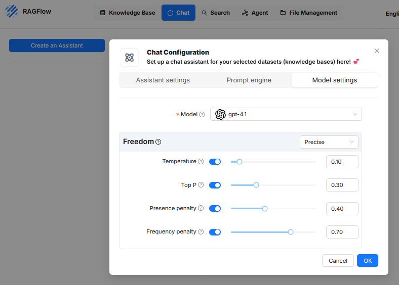 En la pestaña Model settings de la configuración de chat en RAGFlow se definen parámetros que controlan el comportamiento de respuesta del modelo de lenguaje subyacente. Estos ajustes no afectan la selección de contenidos de la base de conocimiento, sino la forma en que el modelo trabaja con ellos y genera texto. El objetivo es regular la calidad de la respuesta, la precisión, la expresividad y la redundancia. Están disponibles los siguientes parámetros: