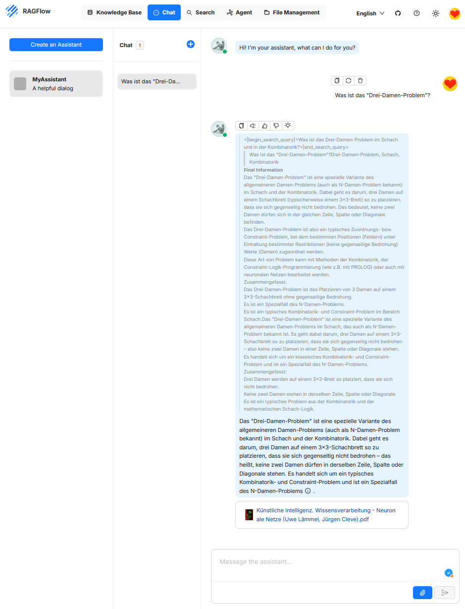 La función „Chat“ sirve de interfaz de usuario para consultas interactivas en un sistema apoyado por recuperación. Se recibe una entrada en lenguaje natural del usuario, que un Large Language Model interpreta y combina con el objetivo de extraer información relevante de una fuente de conocimiento conectada. El componente de chat es el panel central para acceder a la lógica de recuperación y generación de RAGFlow y permite explorar el contenido de documentos de manera exploratoria, basada en preguntas e interactiva. A diferencia de chatbots clásicos como ChatGPT, la respuesta no se basa en el conocimiento general del modelo, sino en los contenidos recuperados previamente de la base de conocimiento.