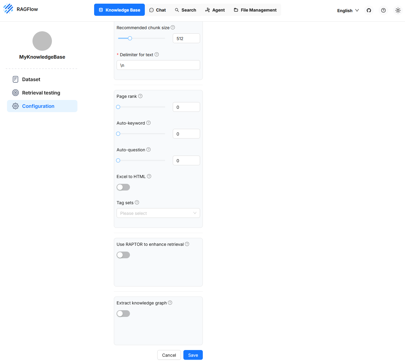 La función Use RAPTOR to enhance retrieval en RAGFlow activa un método avanzado de consulta que se basa en el uso de un grafo de conocimiento. Este grafo debe haberse generado previamente con Extract knowledge graph.