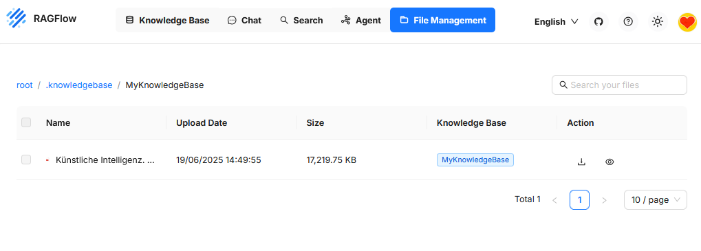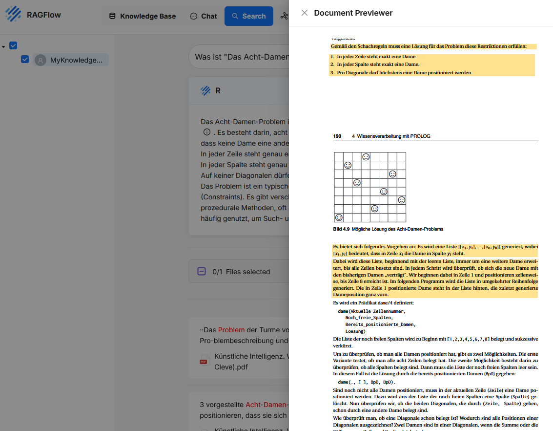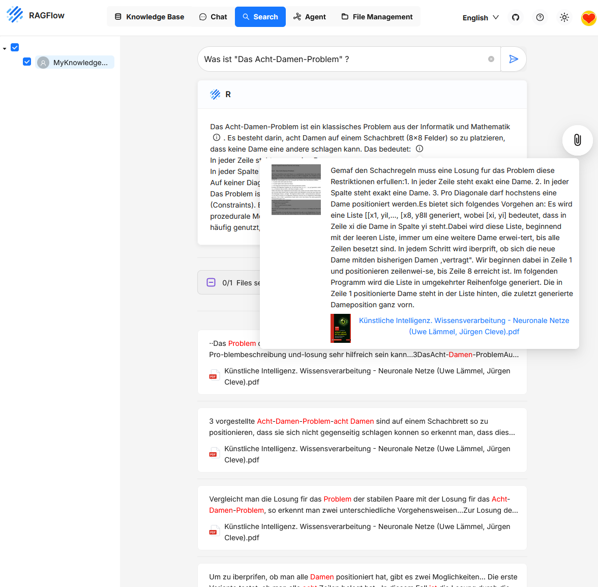 Los usuarios ingresan una consulta de texto en el campo de búsqueda, por ejemplo una pregunta o una palabra clave. RAGFlow busca en las Knowledge Bases conectadas fragmentos con alta coincidencia de contenido. Los resultados incluyen un extracto del contenido encontrado, acompañado del nombre de archivo y la posición en el documento. Al hacer clic en un resultado, se abre una vista previa con el fragmento completo y su contexto.