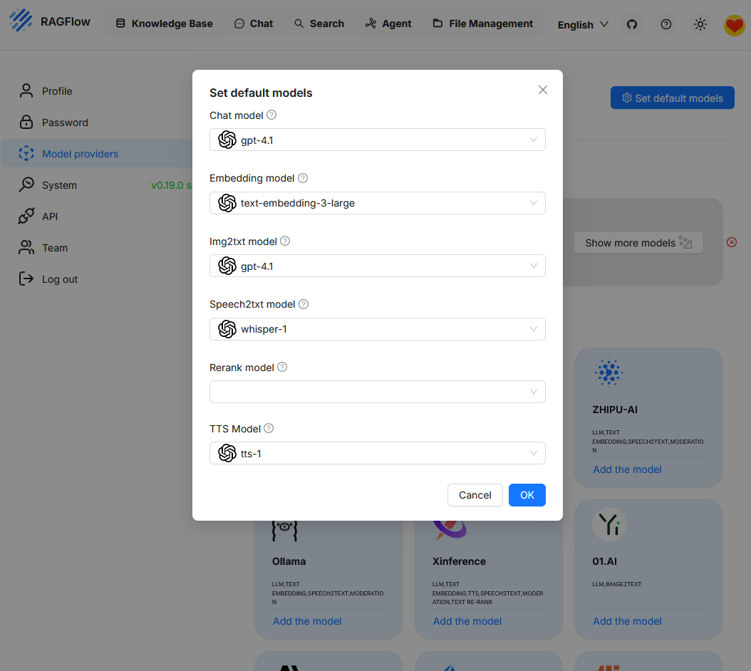 Al invocar „Set default models“ se muestra la configuración de modelo actualmente activa. Dado que hasta ahora solo se ha integrado „OpenAI“ como proveedor, actualmente sólo este modelo está disponible para seleccionar. Para poder utilizar funciones adicionales como el re-ranking, primero debe añadirse otro modelo.