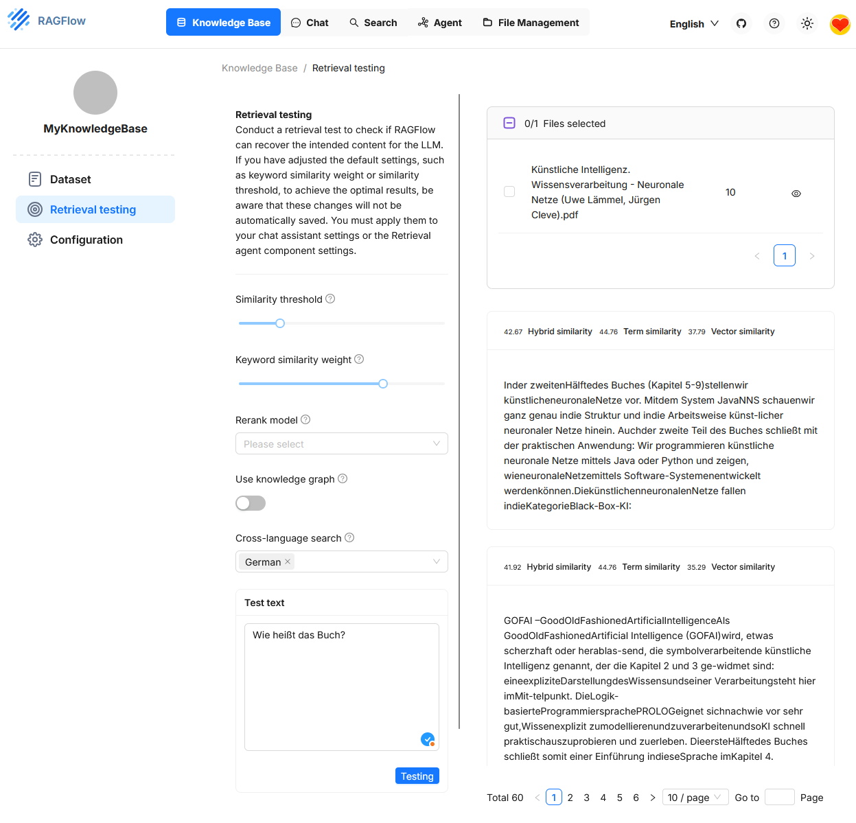 En „Retrieval Testing“ se puede comprobar si el sistema encuentra correctamente fragments relevantes de una Knowledge Base existente para una pregunta concreta del usuario. En el campo de prueba inferior izquierdo, por ejemplo, se introdujo la pregunta „¿Cómo se llama el libro?“. En el lado derecho se muestran las respuestas encontradas. Los valores de similitud para cada fragmento aparecen triplicados: Hybrid Similarity, Term Similarity y Vector Similarity.