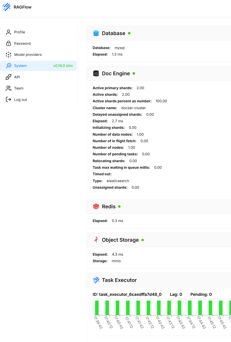 Verifica la conectividad y el correcto funcionamiento del almacenamiento de objetos (aquí MinIO). En RAGFlow, Object Storage se usa para guardar de forma persistente los documentos y otros archivos subidos o procesados. - Task Executor