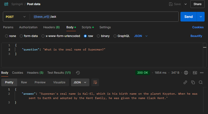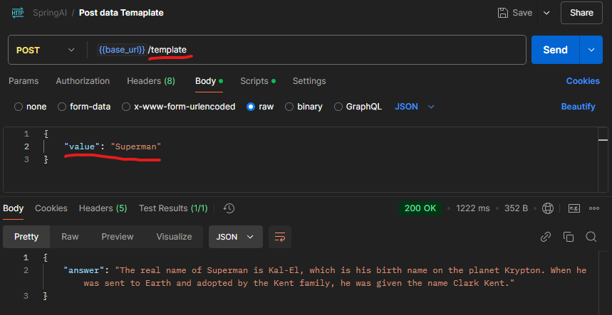 En este caso, via Postman solo quiero enviar el nombre “Superman” al nuevo endpoint “template”. En segundo plano, la palabra “Superman” se inserta en el siguiente Sazt/pregunta/plantilla y se responde: “What is the real name of {value}?”.