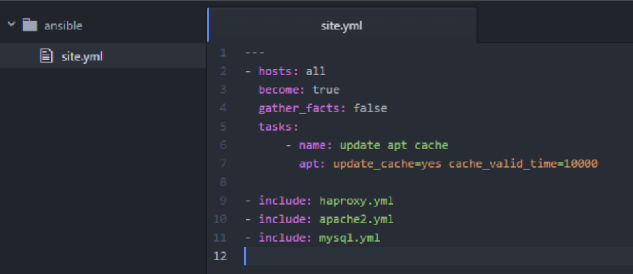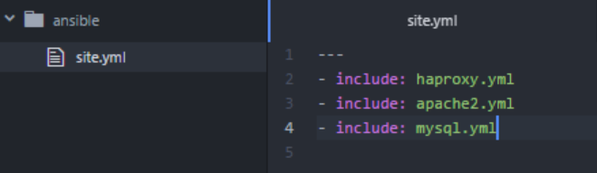 cd ~/.ansible touch haproxy.yml touch apache2.yml touch mysql.yml