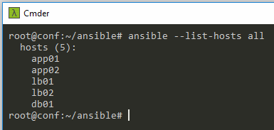 // Llamada a los grupos individuales (hosts) del archivo inventory ansible –list-hosts all ansible –list-hosts “*” ansible –list-hosts webserver ansible –list-hosts loadbalancer ansible –list-hosts db01 ansible –list-hosts “db*” ansible –list-hosts webserver:databases ansible –list-hosts webserver[0] ansible –list-hosts webserver[1] ansible –list-hosts \!webserver