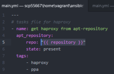 // Uso de la variable vi /home/vagrant/ansible/roles/haproxy/tasks/main.yml “{{ repository }}”
