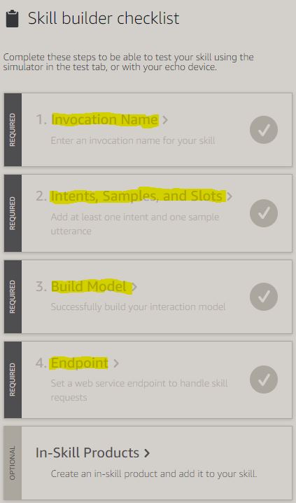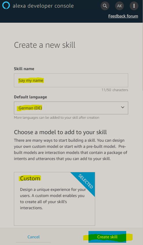 | Invocation | Bei den selbst erstellten Skills ist es so, dass man zuvor die Name der Anwendung sagen muss z.B. “Alexa, starte ’name der Anwendung’. Bei ‘invocation’ handelt es sich um diesen Namen. |