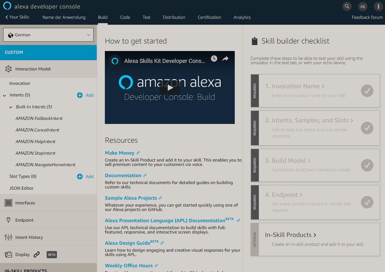 Die ‘Alexa Developer Console’ hilft uns dabei, das sogenannte ‘Interaction Model’ zu erstellen. Dieses Modell dient dazu, die gewünschte Anwendung zu beschreiben und die Sätze und Parameter zu definieren, worauf Alexa später reagieren sollte. Die Programmierung der Logik wird NICHT in der Developer Console vorgenommen sondern in AWS Lambda.