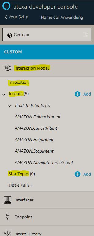 | Slot Types | Jeder Slot ist von einem bestimmten Typ z.B. AMAZON.FIRST_NAME, AMAZON.Room usw. |