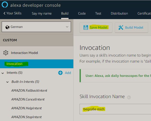 Die Anwendung soll mit “Alexa, starte begrüße mich” gestartet werden: