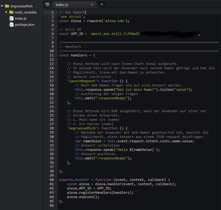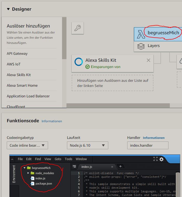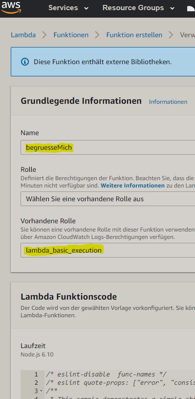 Innerhalb von Lambda erhalten wir durch Auswahl der Funktion ‘begruesseMich’ Zugriff auf die web-basierte IDE. Dadurch, dass wir zuvor die Vorlage ‘‘alexa-skill-kit-sdk-factskill’’ verwendet haben, wurden alle benötigten Bibliotheken bereits importiert: