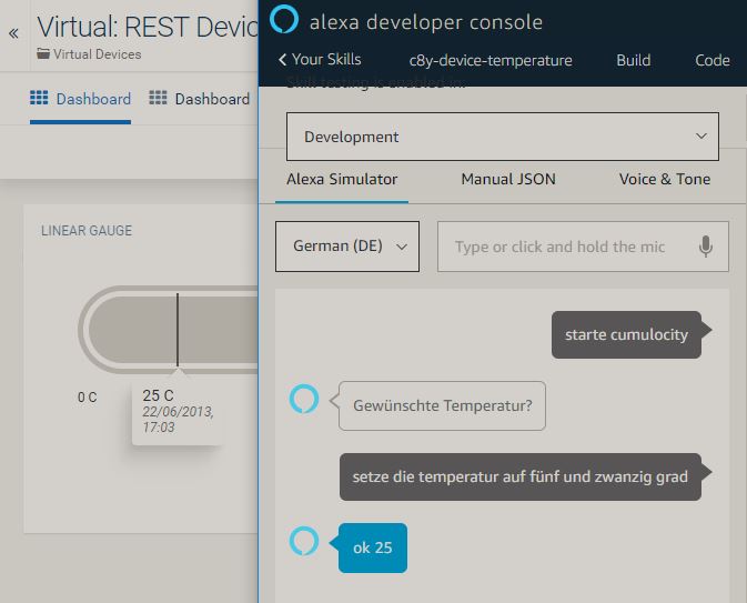 const handlers = { ‘LaunchRequest’: function () { this.response.speak(“Gewünschte Temperatur?”).listen(“value”); this.emit(":responseReady”); }, ‘cumulocity’: function () { var temperature = this.event.request.intent.slots.grad.value; this.response.speak(`ok ${temperature}`); setTemperature(parseInt(temperature,10)); this.emit(":responseReady”); }, };