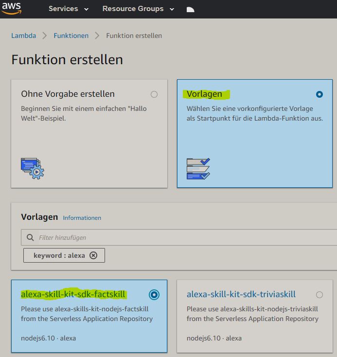 Das folgende Beispiel zeigt die Erstellung einer einfachen Alexa Anwendung (Skill) mit Hilfe von ‘Alexa Developer Console’ und ‘AWS Lambda’.
