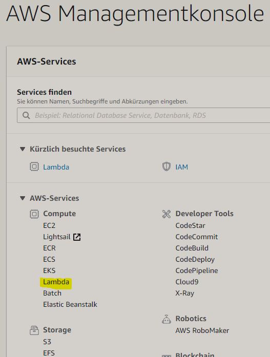 Lambda ist ein Produkt aus der Amazon Web Services (AWS) Familie und bietet uns unter anderem die Möglichkeit, die gewünschten Funktionen mit Hilfe einer web-basierten IDE zu schreiben und auszuführen. Die Ausführung erfolgt durch einen Trigger z.B. durch den Alexa Skill.