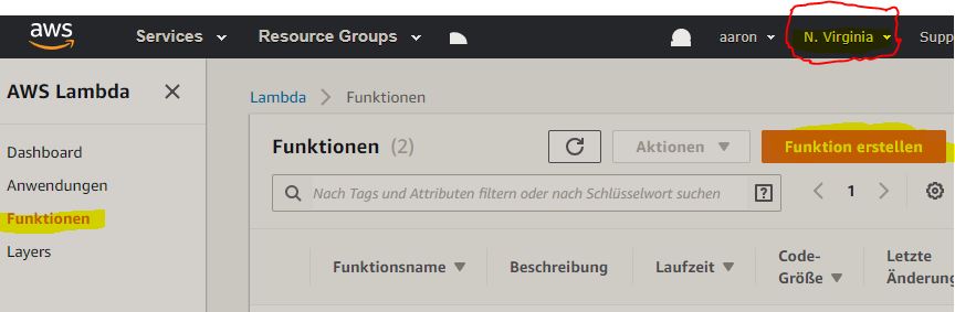 Nach Aufruf von Lambda können wir wie folgt eine neue Funktion erstellen. Als Region muss ‘N.Virginia’ ausgewählt werden.