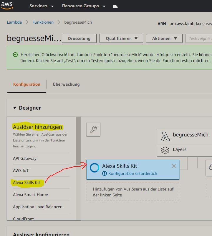 Im nächsten Schritt sagen wir der Funktion, wodurch sie aufgerufen werden sollte. In unserem Fall möchten wir, dass Alexa die Funktion aufruft (Trigger).
